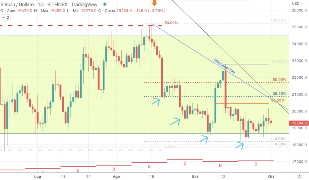 Tagliando il tempo e scendendo su un grafico daily andiamo a vedere cosa ha fatto Bitcoin in questi mesi estivi all’interno del box evidenziato. Dai minimi ha rimbalzato e si è fermato a 25205$, proprio dove cadeva il livello 50 di Fiobancci del vettore dato dai massimi a 32000$ fino ai minimi del 13 Giugno.