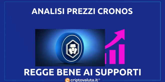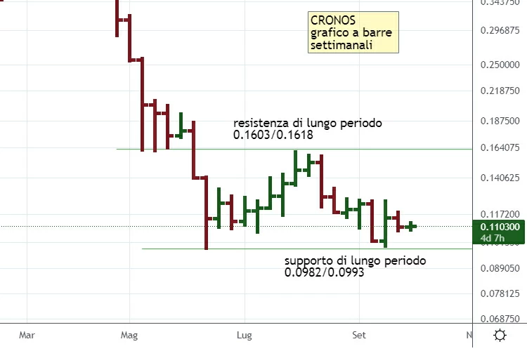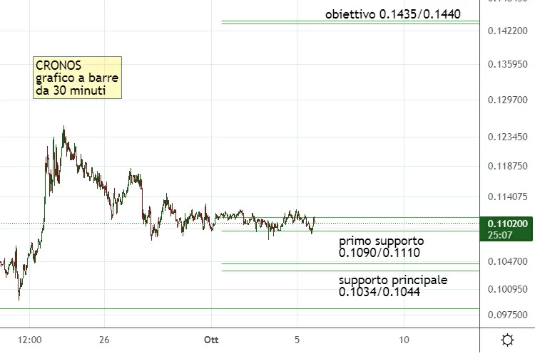 Le proiezioni indicano un obiettivo a 0.1435/0.1440. Si tratta di proiezioni abbastanza ambiziose, con un target relativamente ampio se confrontato con la breve distanza che separa i valori odierni dal supporto principale. Abbiamo quindi un teorico rapporto fra rischio/beneficio molto favorevole per una posizione long. Il segnale tecnico in vigore verrebbe annullato dall’eventuale cedimento di quota 0.1034, meglio se confermata da almeno una chiusura inferiore su grafico a 30 minuti. Quando sono le ore 20.11 di mercoledì 5 ottobre, nei migliori crypto exchanges Cronos viene scambiato contro dollaro a 0.1101, in calo dell’1.30% su base giornaliera.