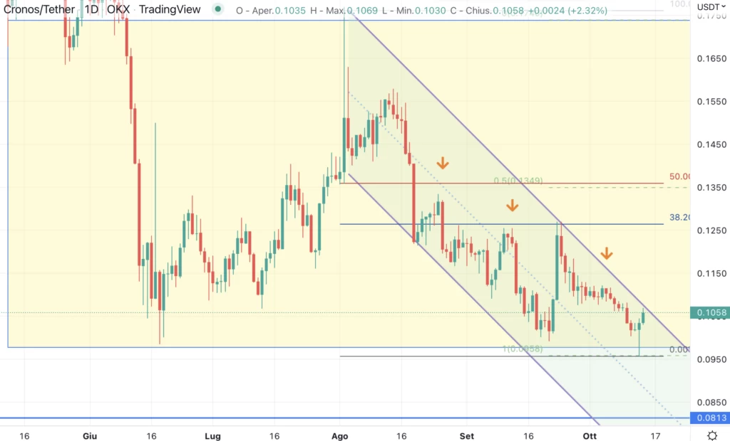 Questi eventi si sono ripercossi sull’andamento di Cronos, nel bene e nel male. Focalizzandoci sul grafico daily e su quello che è accaduto in questi ultimi mesi estivi. Prima constatazione è che il prezzo sta rompendo i precedenti minimi annuali fatti a Giugno. Nell’arco del mese di Giungo quasi tutto il mercato crypto toccò i minimi annuali, ma Cronos è la prima tra le principali ad andarli a rompere e segnarne uno nuovo.