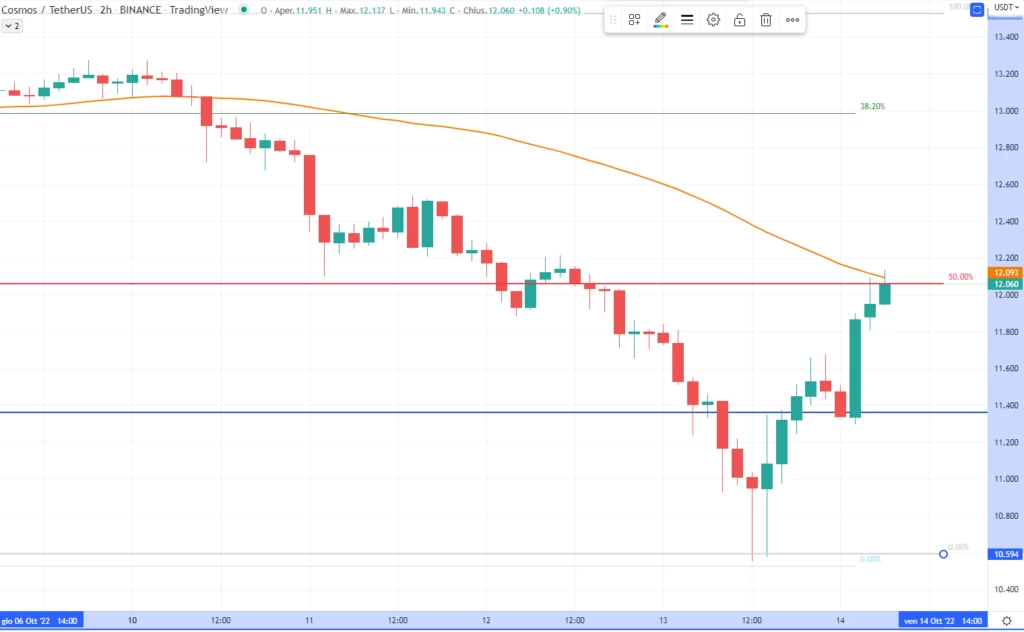 Sul grafico 2H, possiamo vedere nel dettaglio i livelli con cui si dovrà scontare ATOM. Se questo pattern di inversione si concretizzerà nella giornata di oggi, Cosmos dovrà andare a superare un primo livello 12.15$ dove passa anche la mediam mobile (Sma50). Per gli obiettivi successivi, dobbiamo individuare il vettore dominante che è quello che parte dai massimi relativi a 17.2$ fino ai minimi di ieri a 11.100$. Con l’ausilio dei ritracciamenti di Fibonacci, troviamo un primo obiettivo a 12.90$ e poi un successivo dato dal 50% dove la resistenza passa in area 13,75$. Quest’ultimo sarà lo spartiacque per la prosecuzione del trend rialzista o per un ritracciamento.