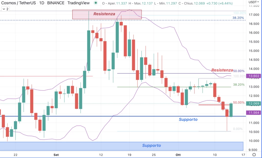 Dal grafico, si può osservare anche, che ATOM ha rotto il supporto che avevano indicato nel nostro ultimo articolo, Cosmos modifiche al white paper, il prezzo di ATOM ne beneficerà?. Indicavamo – ..il livello supportivo più importante l’abbiamo a 11,100$ dove passa il livello 50 di Fibonacci. – Il vettore citato è quello principale che parte dai minimi di Giugno a 5.100$ fino ai massimi a 17.19 di Settembre. La rottura del supporto è avvenuta con uno spike ribassista ed assorbita rapidamente, infatti ATOM a fine giornata, ha chiuso sopra il livello supportivo.