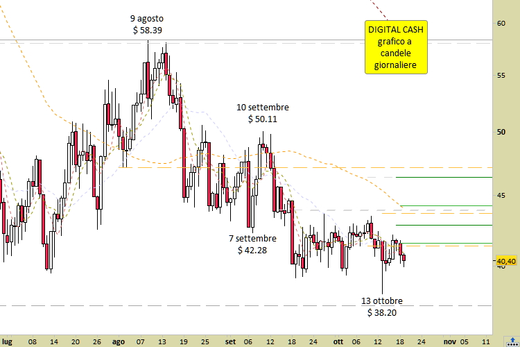 Le quotazioni di Digital Cash (DASH) risultano in flessione sin dall’inizio della settimana, a partire dai massimi relativi di quota 42.13 toccati domenica 16 contro il dollaro americano. Purtroppo non si tratta di un evento circoscritto al solo breve periodo. Il grafico a candele giornaliere evidenzia infatti un contesto in progressivo deterioramento sin dallo scorso agosto, quanto la crypto ancora veniva scambiata sopra i 58 dollari. Appena il 13 ottobre scorso DASH ha peraltro raggiunto minimi a 38.20, il valore più basso dal 2020, mettendo ben in chiaro quale sia l’impostazione dominante con cui il mercato deve confrontarsi.