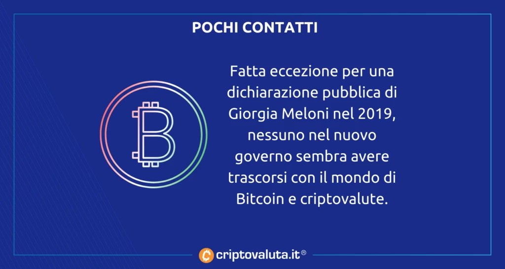 Il Governo Meloni si è insediato dopo aver giurato al Quirinale. Non essendo Criptovaluta.it una testata che si occupa di politica, qualcuno dei nostri lettori si starà interrogando sul perché di questa precisazione. Semplice: cercheremo di capire cosa sta succedendo dalle parti di Palazzo Chigi, o meglio quello che potrebbe succedere riguardo Bitcoin, Ethereum, stablecoin e il resto della truppa.