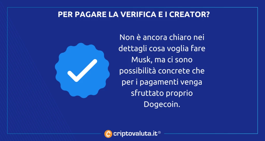 È una delle prime proposte di Elon Musk. 8$ per ottenere una verifica – non è chiaro se della stessa qualità di quella conquistata sul campo da Criptovaluta.it. Qualcosa che potrebbe generare un certo cash flow (si tratterebbe dopotutto di un pagamento mensile) con Dogecoin che potrebbe rientrare dalla finestra ed essere accettato come metodo di pagamento.