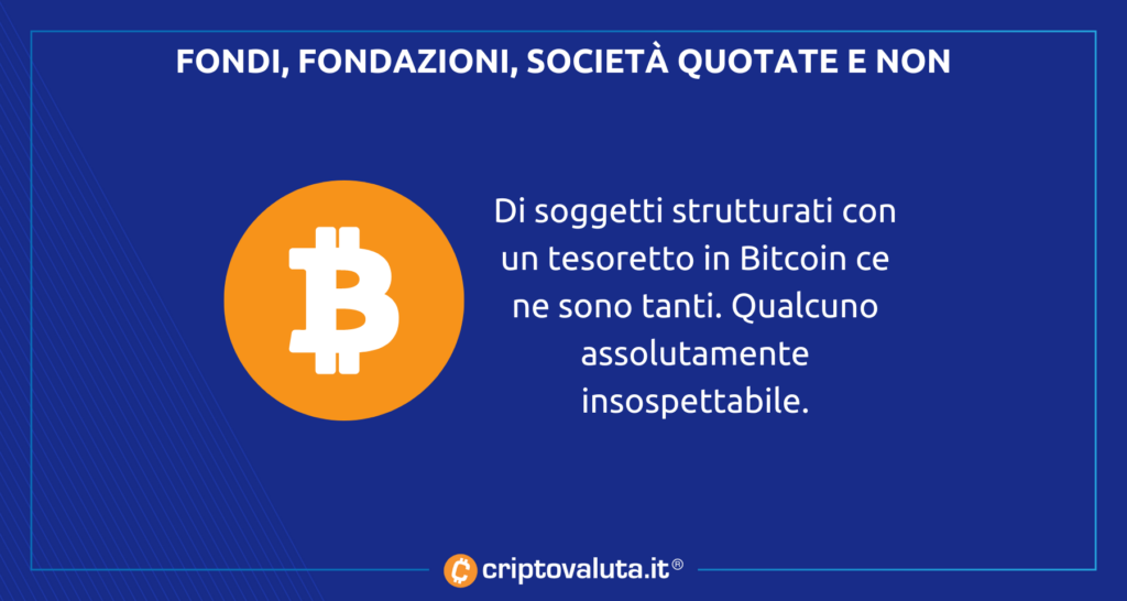 Si tratterebbe di dotazioni per oltre 1.380.000 Bitcoin complessivamente distribuiti tra società private, società quotate, governi e anche fondi. Una somma che complessivamente varrebbe circa il 6,5% del totale di Bitcoin emessi. Con il resto che sarebbe nelle mani di privati, degli exchange (anche e soprattutto per conto dei privati) e di altri tipi di soggetti non strutturati. Il che vuol dire che nel complesso siamo davanti ad una situazione dove si spazio per i più importanti operatori del comparto ce n’è ancora tanto.