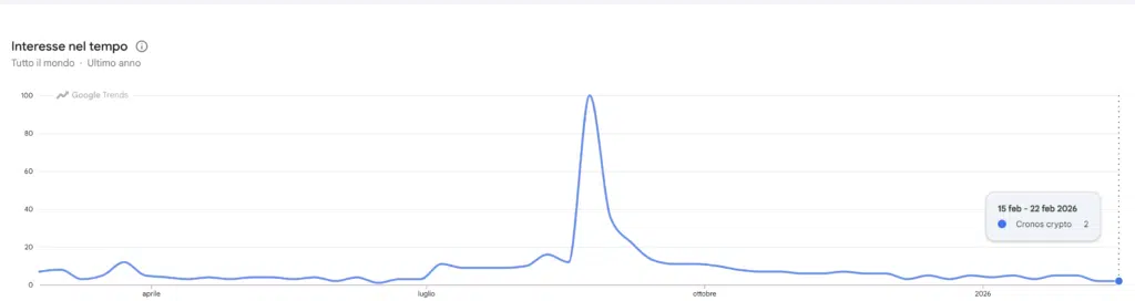 Il grafico di Google Trends mostra l’interesse nel tempo per la ricerca “Cronos crypto” nell’ultimo anno a livello globale. Si nota un forte picco tra settembre e ottobre, seguito da un calo costante. Il numero indicato, pari a 2, rappresenta un livello molto basso di interesse relativo rispetto al massimo, fissato a 100.