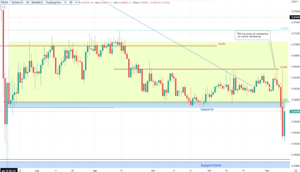 Anche Tron stava tradando in una fase di bassa volatilità, in un sostanziale trading range, ma ieri ha avuto uno scossone sull’impennata di volatilità del mercato. Le bad news sull’insolvenza di FTX ed il crollo del suo token FTT, hanno fatto scendere Tron del 9% nelle ultime 48 ore.