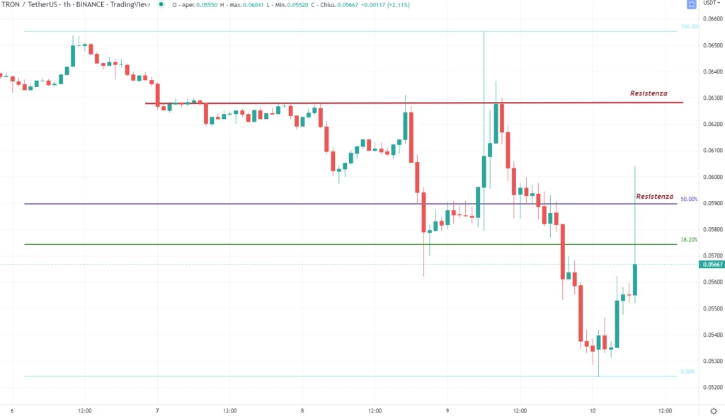 Sul grafico seguente su time frame 1H, possiamo focalizzarci sulle ultime ore di Tron. Se il prezzo non arriva al supportone, ma prova a ripartire da questa zona, deve arrivare al break out del livello di prezzo di 0.59/0.60$, con chiusure daily, sopra il livello. Il secondo livello è statica in area 0.63$.