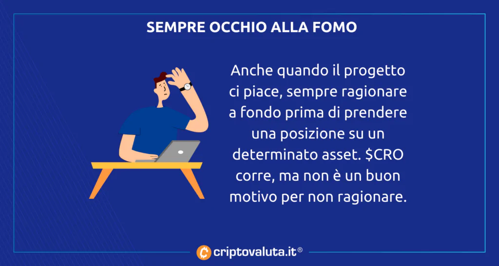 Bisognerebbe sempre però stare lontani dalla FOMO e dalla frenesia che potrebbe portarci ad acquisti non ponderati, anche quando si tratta comunque di progetti seri, affidabili e che hanno alle spalle giganti come Crypto.com. Il nostro consiglio è, a prescindere dal prezzo di questo token adesso, di valutare quanto possa esserci di buono anche sul medio e lungo periodo.