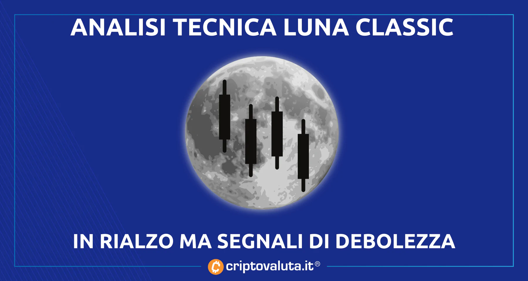 Al momento il rimbalzo di Luna Classic è abbastanza contenuto, infatti dal supporto fa segnare un +15%. Sul grafico è riportato anche il setup degli indicatori che sta dando qualche segnale di debolezza, infatti stanno flettendo se pur ancora in positivo.