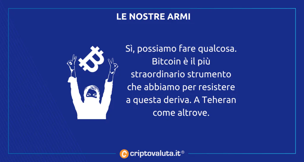 Bitcoin fixes this – Bitcoin sistema questo problema, amano ripetere i massimalisti, cioè i più integralisti tra gli amanti di $BTC. Questa volta però anche i più scettici dovranno dargli almeno una parte di ragione. Perché quanto sta avvenendo in Iran dovrebbe ricordarci l’importanza di un sistema monetario che non può essere censurato e dal quale non può essere escluso nessuno. Come quello di Bitcoin.