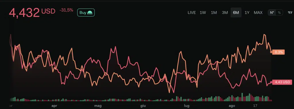 Già da dicembre era però iniziata un’ulteriore fase ribassista, con chiusura mensile a -34,30% e l’avvio di una sequenza di quattro mesi negativi, fino a toccare un minimo in aprile 2025 a 3,9 USDT. Questo livello è stato nuovamente rotto a giugno 2025 con un affondo a 3,747 USDT.