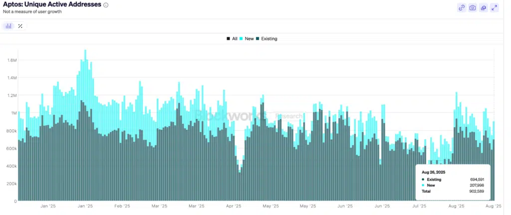 Le metriche on-chain confermano ulteriormente la solidità della rete. Il grafico sugli indirizzi attivi unici di Aptos, relativo al periodo gennaio–agosto 2025, mostra oscillazioni costanti: picchi superiori a 1,5 milioni a inizio anno e fasi di calo tra aprile e giugno.