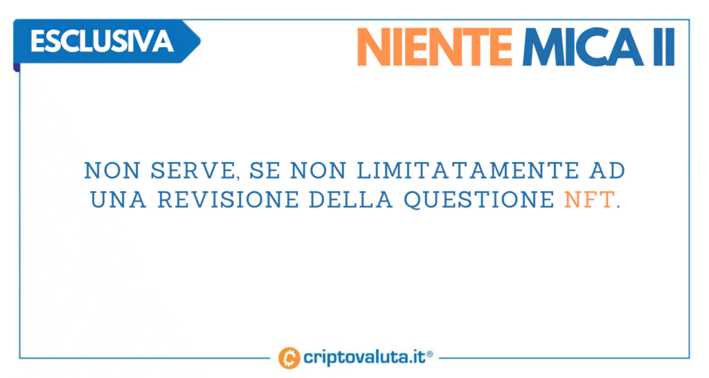 Ipotesi però rispedita al mittente da Stefan Berger: obiettivo, dice, è quello di vedere il MiCA in vigore. Posizione ad avviso di chi vi scrive condivisibile: bisognerebbe cercare di fissare prima un perimetro, renderlo operativo (il tempo corre) e poi valutare quali siano le eventuali mancanze.