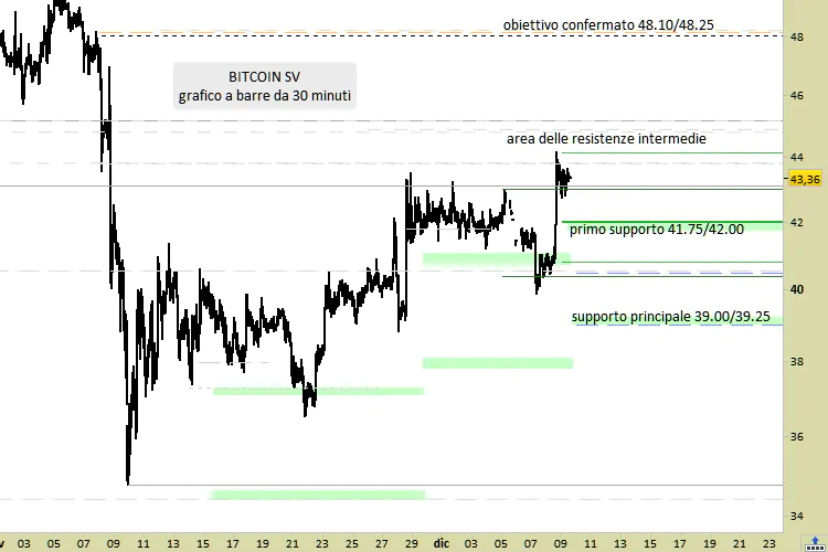 L’ostacolo principale sulla strada del rialzo è posto nell’ampia area fra 43.85/45.20, ove transitano in questo momento diverse resistenze dinamiche. Le aspettative sono comunque di superamento di tali resistenze, a favore di un allungo fino a 48.10/48.25. Il segnale tecnico è long su nuovi test dei supporti, in ogni caso da rilevazioni non superiori a 42.43. Lo stop per lo scenario scatterebbe solo con la violazione del supporto principale, mediante una chiusura su grafico a 30 minuti inferiore a 39.00. Mentre sono le 14.08 CET di venerdì 9 dicembre, BSV viene scambiato sui migliori crypto Exchange a 43.53 dollari, in aumento del +1.44% su base giornaliera.