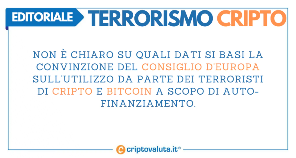 E il diritto a non essere trattati come dei delinquenti senza aver commesso alcun tipo di reato. Tutto questo mentre il terrorismo continuerà a finanziarsi tramite i canali che ha sempre utilizzato. Che no, non sono quelli di Bitcoin e criptovalute. Credete il contrario? L’onere della prova, finché vivremo in un luogo con un minimo rispetto per il diritto, è a carico di chi afferma una tesi, non a carico di chi la nega.