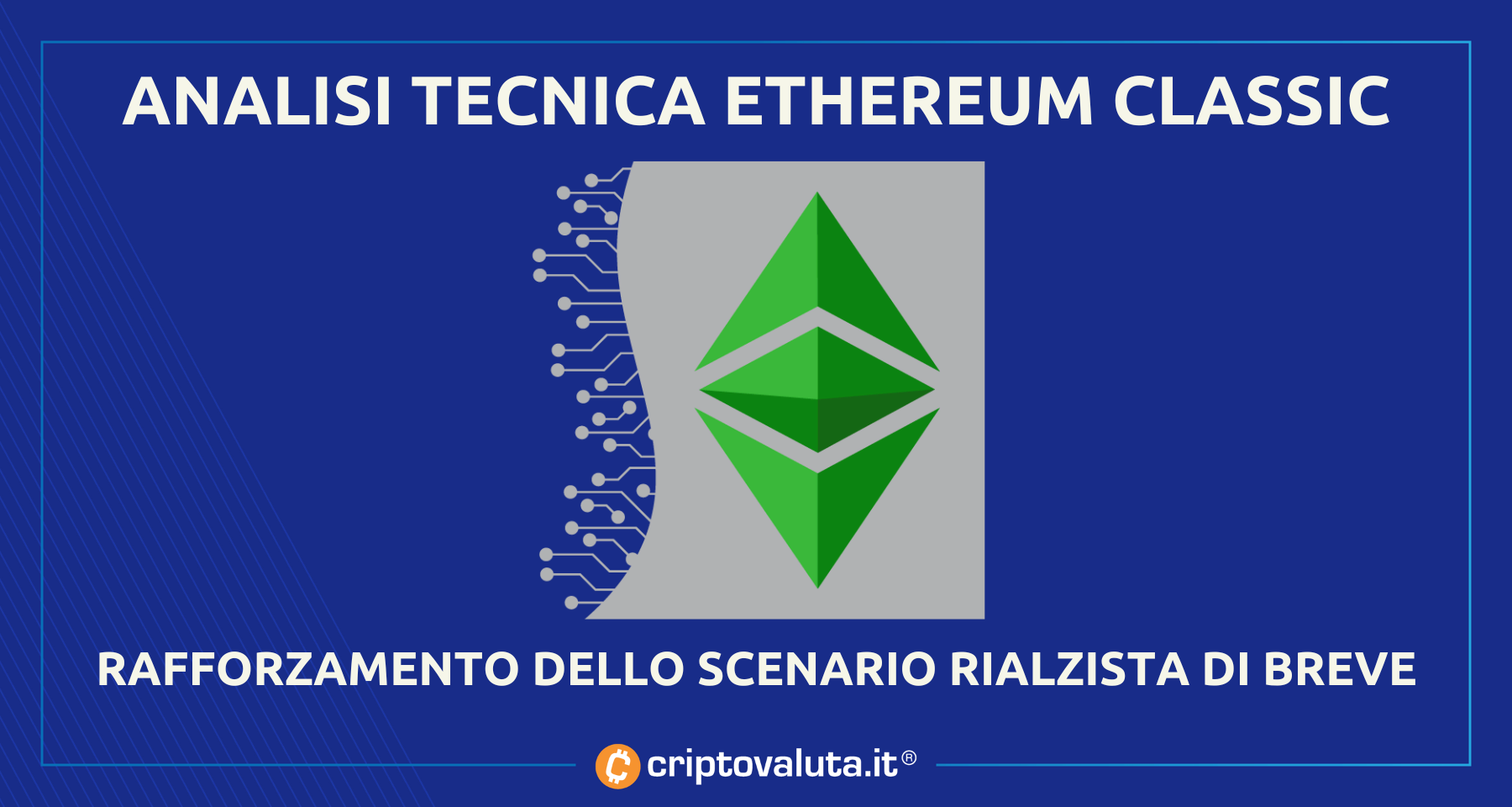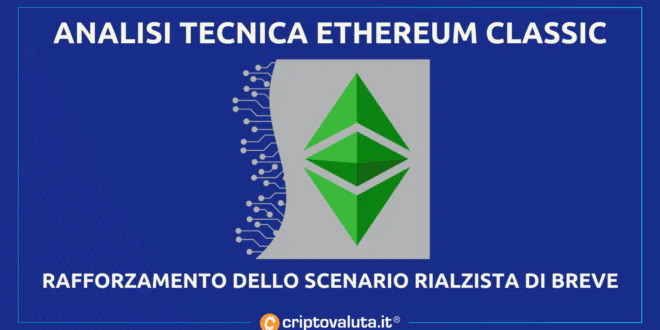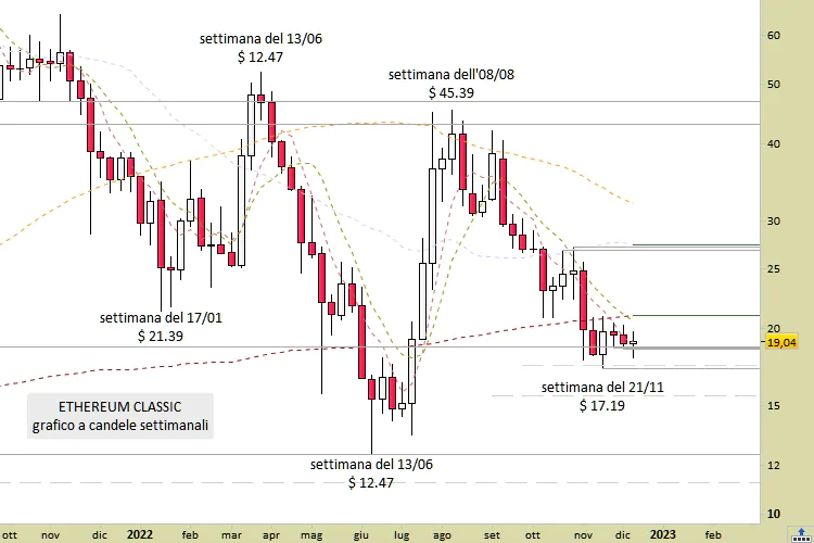 Si tratta di un movimento, a nostro avviso, piuttosto significativo in chiave tecnica. ETC si era infatti spinto, con i recenti ribassi, fino al test di una serie di supporti di assoluto rilievo, almeno per quanto riguarda il breve periodo (=prossime 10-15 giornate). Sull’attuale posizionamento di tali supporti ci soffermeremo più avanti, con dovizia di particolari, analizzando il grafico a scansione intraday. Per approfondire lo scenario di fondo, entro il quale si è generato il recupero odierno, esaminiamo invece per prima cosa il grafico a candele settimanali.