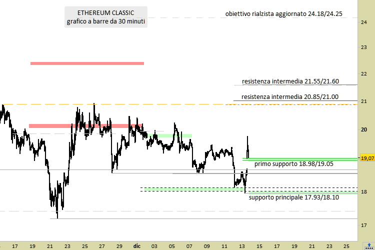 Anche la disposizione dei supporti va affinata rispetto alle ultime analisi. I compratori si stanno concentrando adesso a 18.98/19.05 e fra 17.93/18.10, punti di probabile reazione in caso di nuovi arretramenti. Il segnale tecnico è long su test dei supporti, in ogni caso da rilevazioni non superiori a quota 20.00. Lo stop per lo scenario tecnico scatterebbe solo in caso di rottura del supporto principale, mediante la semplice violazione di quota 17.93, senza attendere alcun’altra conferma. Quando sono le 19.13 CET di martedì 13 dicembre, ETC viene scambiato sui migliori Exchange a 19.07 dollari, in aumento del +2.80% da ieri.