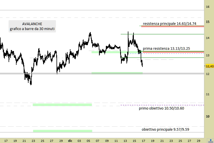 Le proiezioni aggiornate indicano obiettivi a 10.50/10.60 ed a 9.57/9.59. Al raggiungimento di quest’ultimo livello, posizionato in corrispondenza di un forte supporto, dovremo attendere segnali dal mercato prima di aggiornare di nuovo lo scenario. Il segnale tecnico è short su nuovi test delle resistenze, in ogni caso da rilevazioni non inferiori a 12.76. Il quadro descritto verrebbe annullato e rivisto solo nell’eventualità di rottura della resistenza principale, mediante una chiusura su grafico a 30 minuti superiore a 14.74. Mentre sono le 20.28 CET di venerdì 16 dicembre, AVAX viene scambiato sui migliori Exchange mondiali a 12.46, in calo del -5.47% su base giornaliera.
