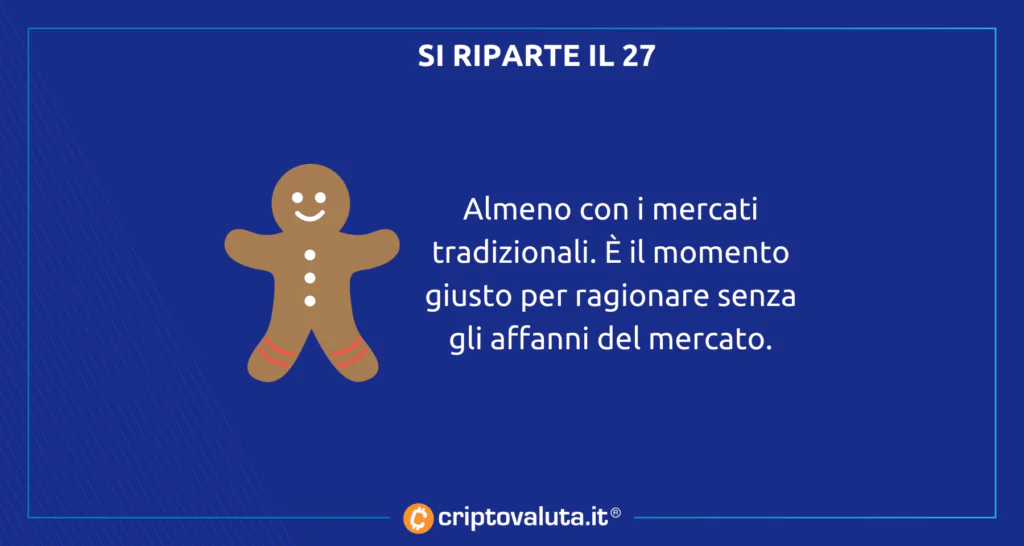 Pace momentanea oppure periodo di vacanze più tranquillo e che può permettere di fare ragionamenti più di lungo periodo, senza l’affanno della volatilità? Non vi è certezza: se dovessimo prendere per buono e replicabile quanto avvenuto l’anno scorso, si tornò a fare trading con volumi più interessanti dal 28 dicembre. Per l’anno precedente, nel natale 2020, si tornò invece a puntare forte già dal 26 dicembre. E anche in termini di trend difficile dire come si vivranno queste feste, perché se l’anno scorso fino al 6 gennaio si ebbe un percorso vacanziero da incubo, soltanto l’anno prima si passò da 23.000$ a 32.000$ per l’Epifania. Non ci sono pattern, non vi sono anticipazioni ed essendoci pochi dati che arrivano dall’economia “reale” e in termini macro, sarà difficile fare una previsione per quest’anno.