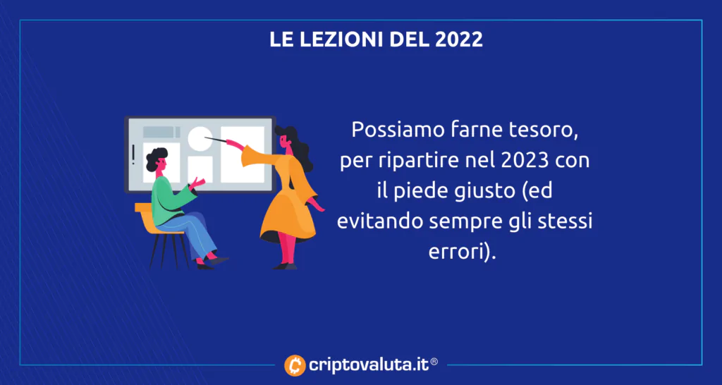 Ci siamo finalmente lasciati alle spalle un 2022 orribile sotto ogni punto di vista, almeno in relazione all’andamento dei prezzi di Bitcoin e di tutte le principali criptovalute. Per quanto sia questo un boccone amaro da mandare giù, possiamo cercare di trasformare 12 mesi non al top in preziose lezioni per il futuro.