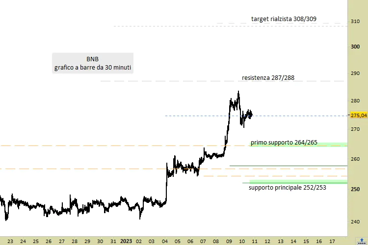 Lo scenario descritto verrebbe annullato solo dall’eventuale rottura del secondo supporto, mediante una chiusura su grafico a 30 minuti inferiore a 252. Mentre sono le 18.52 CET di martedì 10 gennaio, BNB viene scambiato sui migliori Exchange mondiali a 275.18 dollari, in aumento del +0.98% su base giornaliera.