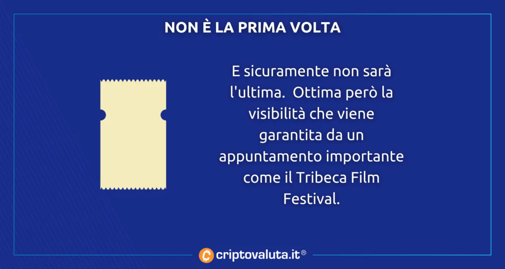La i suoi possibili usi, la tecnologia NFT si presta particolarmente bene alla vendita di pass e biglietti per eventi, tanto da portare alla creazione di marketplace di biglietti per eventi come SeatlabNFT. Nel caso del Tribeca Film Festival, i NFT creati in collaborazione con l’exchange di criptovalute OKX avranno la funzione di VIP pass con vantaggi esclusivi. Il possesso di questi pass permetterà l’accesso alle proiezioni dei film in anteprima e l’invito a eventi esclusivi con i co-fondatori del festival, Jane Rosenthal e Robert De Niro.