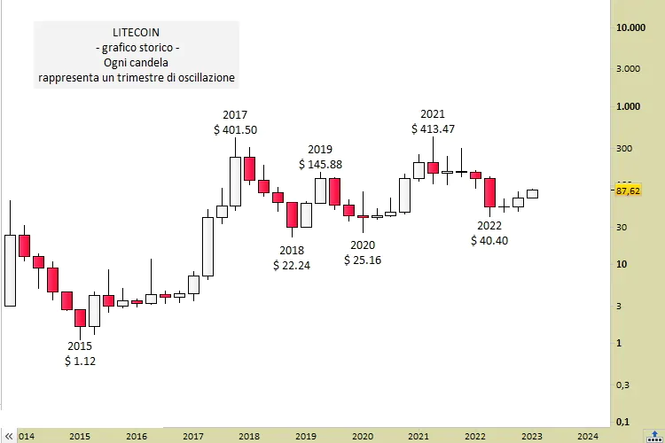 Il rialzo di LTC è stato ovviamente intramezzato da periodi correttivi anche ampi, come quello registrato a novembre 2022 in occasione del crack della piattaforma FTX, su cui spesso ci siamo soffermati. Ciononostante, un grafico storico di questo token dal 2013 ad oggi evidenzia un guadagno di valore tribolato ma costante, indice di solida fiducia da parte degli investitori.