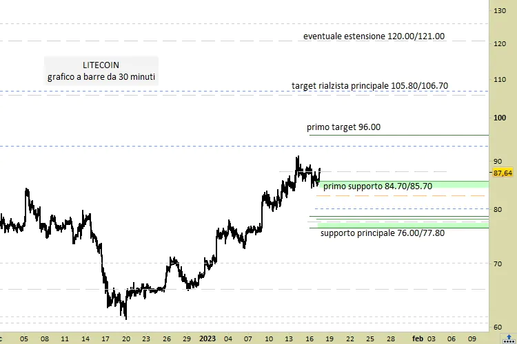 Il segnale tecnico è long su test dei supporti, in ogni caso da rilevazioni non superiori a 87.70. Lo stop per lo scenario descritto scatterebbe solo con la violazione del supporto principale, mediante una chiusura su grafico a 30 minuti inferiore a 76.00. Mentre sono le 15.04 CET di martedì 17 gennaio, LTC viene scambiato sui migliori Exchange mondiali a 87.90 dollari, in aumento del +2.34% su base giornaliera.
