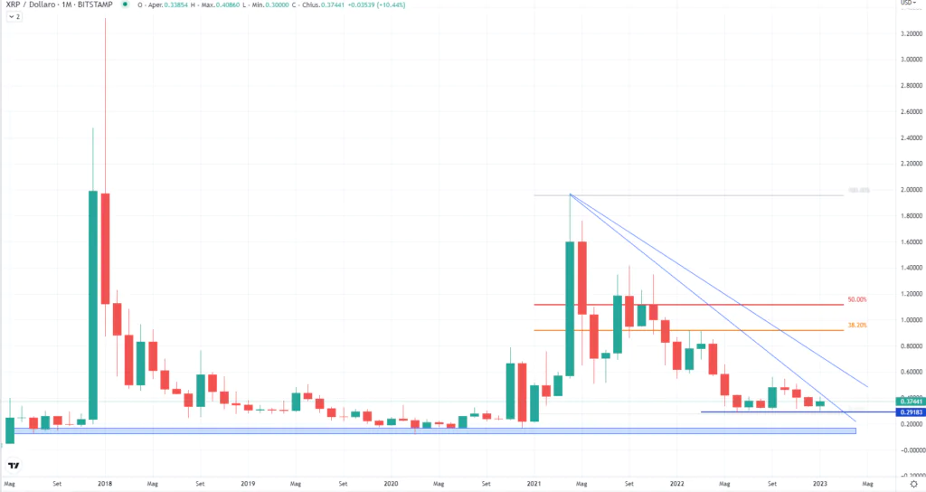Sul grafico monthly, possiamo avere una view di lungo, da cui si intuisce ancora la delicatezza della situazione, con il prezzo che vicino ai minimi di periodo. Una rottura del supporto a 0,30$ potrebbe portare Ripple verso i minimi di Luglio 2020.
