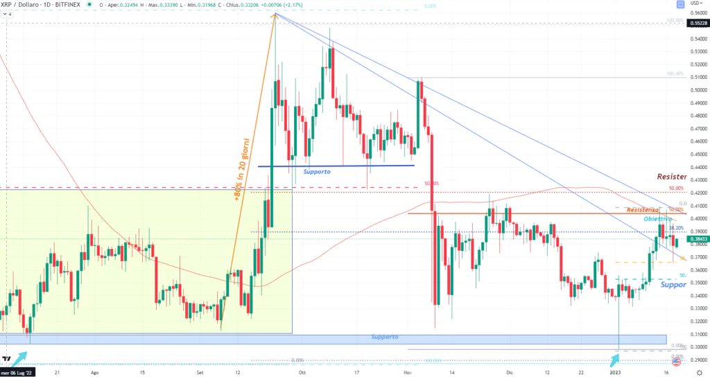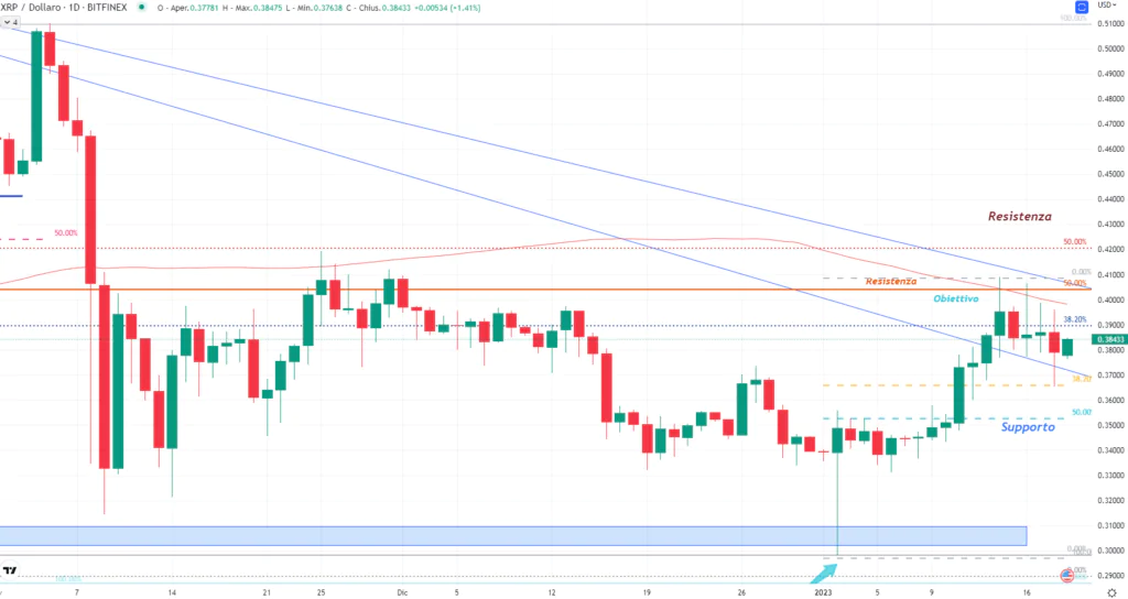 Andando a focalizzarci sull’andamento di Ripple sul breve periodo, osserviamo il grafico daily con una panoramica da Novembre’22 ad oggi. Qui abbiamo evidenziato il vettore che comanda in questo frangente e va da 0,51$ fino ai minimi di 0,2928$.