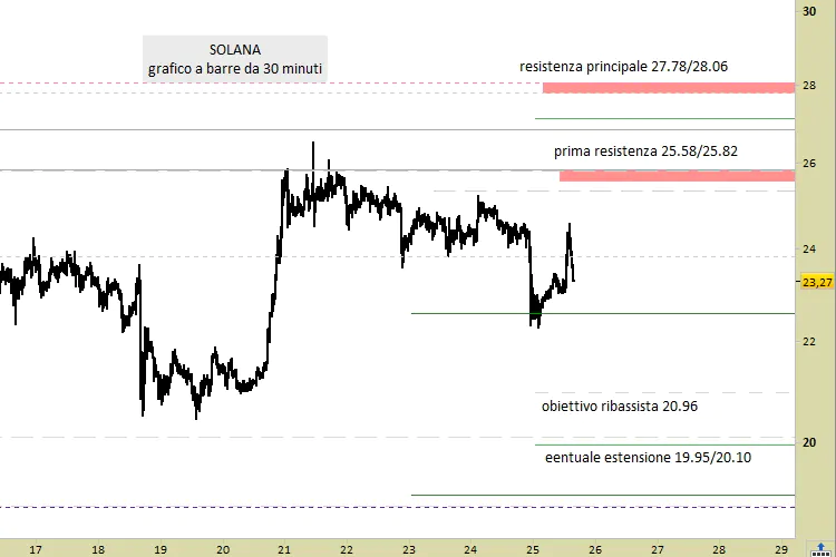 Lo stop per lo scenario descritto scatterebbe solo con una chiusura su grafico a 30 minuti superiore a 28.06, resistenza principale. Mentre sono le 15.56 CET di mercoledì 25 gennaio, SOL viene scambiato sui migliori Exchange mondiali a 23.23 dollari, in aumento del +2.15% su base giornaliera.