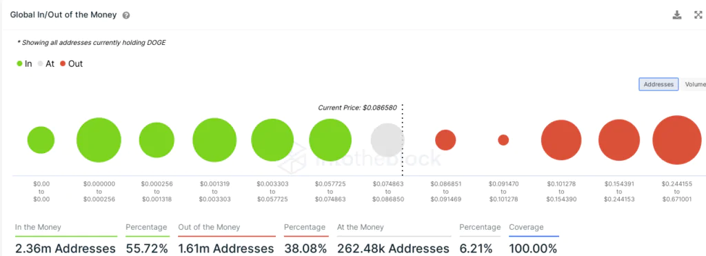 Al prezzo attuale, Dogecoin è sotto dell’87%, dai suoi massimi storici a 074$ toccati a Maggio’21. Ma a fronte di ciò dai dati on-chain forniti da Intotheblock, possiamo vedere che il 55,72% degli indirizzi è in the money, cioè ancora in guadagno. Mentre il 6,21% è all’incirca in break even, la restante parte del 38,028% è invece in perdita.