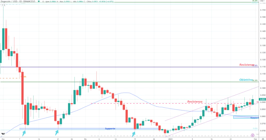 Da inizio 2023 è partita una fase di rimbalzo che abbiamo evidenziato con il movimento all’interno del canale. In questo scenario è ben evidente come il prezzo di Dogecoin, si stia fermando attorno alla resistenza tra 0,089/90$. Nelle ultime ore sta facendo un allungo sopra il livello.