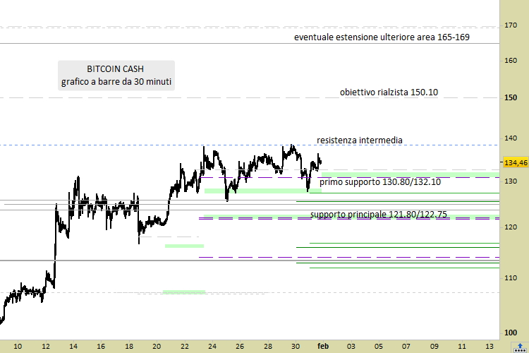 Rispetto alla nostra analisi più recente, pubblicata il 20 gennaio scorso, Bitcoin Cash si è avvantaggiato di un rialzo che ha spinto i prezzi da 120.78 a 138.42. Sono state quindi assecondate quasi perfettamente le proiezioni, che fornivano un target a 138.50. Su grafico a barre da 30 minuti vediamo adesso innanzitutto come i supporti si siano alzati ulteriormente, indicando le concentrazioni degli ordini di acquisto dei compratori.