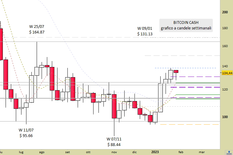 Le quotazioni di Bitcoin Cash (BCH) stanno attraversando dal 23 gennaio scorso una fase di stabilizzazione nel cambio contro dollaro americano. Da nove giornate i prezzi oscillano infatti nel range fra 125.60 e 138.42, mediante ripetuti cambi di tendenza che hanno interrotto, almeno provvisoriamente, la tendenza rialzista di fondo.