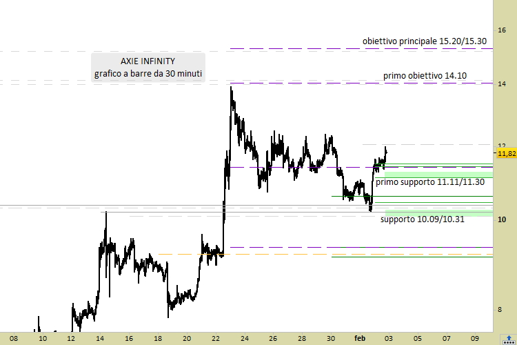 Possiamo premettere che, in tal caso, l’attenzione si sposterebbe immediatamente sui livelli di verifica subito inferiori, posti fra 9.15/9.35. Mentre sono le 20.26 CET di giovedì 2 febbraio, AXS viene scambiato sui migliori Exchange mondiali a 11.63 dollari, in aumento del +1.93% da ieri.