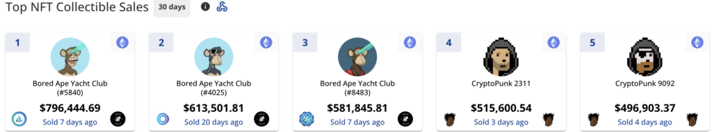 Nell’immagine allegata di cryptoslam, abbiamo la classifica per valore, dei primi 5 collectible venduti negli ultimi 30 giorni, dove primeggiato i BAYC. Al contempo si può notare anche che la blockchain dove girano è quella di Ethereum.