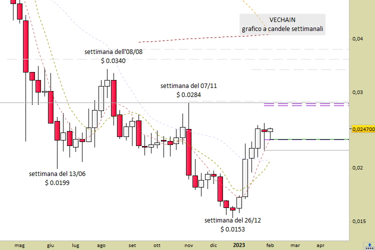 Si tratta di una fase di bonaccia che è giunta al culmine di un rally rialzista maturato in 36 giorni, dai minimi del 30 dicembre scorso a 0.0153. VET si è apprezzato del +66.34% in poco più di un mese, ed il fatto che non siano scattate prese di beneficio rilevanti costituisce già di per sé un ottimo segnale tecnico.