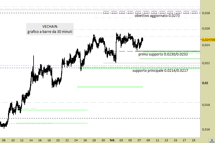 Il segnale tecnico è ancora long, preferibilmente solo su nuovi test dei supporti, in ogni caso da rilevazioni non superiori a 0.0237. Le proiezioni aggiornate puntano verso un target localizzato adesso a 0.0273/75. Lo scenario descritto verrebbe annullato solo dall’eventuale cedimento del supporto principale, mediante una chiusura su grafico a 30 minuti inferiore a 0.0214. Mentre sono le 19.02 CET di martedì 7 febbraio, VET viene scambiato sui migliori Exchange mondiali a 0.0249 dollari, in aumento del +4.85% su base giornaliera.