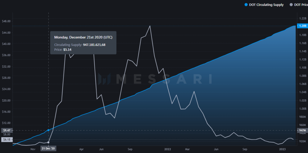 Uno dei problemi di Polkadot è la supply tendenzialmente infinita. Dalla immagine allegata si può vedere come la supply circolante cresce costantemente. Siamo arrivati al ritmo di circa +0,90% mese su mese.