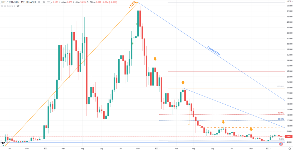 Sul grafico weekly possiamo osservare l’andamento storico si Polkadot dalla sua quotazione ad oggi. Quello che più conta per noi, sono gli ultimi mesi e le trendline tratteggiate in arancione.