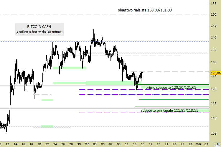 Possiamo quindi legittimamente interpretare la correzione in atto come fase transitoria, funzionale al consolidamento della rottura rialzista stessa. Con il più classico dei pull-back, BCH è tornato ad utilizzare le ex-resistenze nella loro nuova mansione di supporti. Mentre scriviamo sono le 20.23 di martedì 14 febbraio, e a livello globale i migliori Exchange stanno quotando BCH a 126.53 dollari, in rialzo del +2.14%.