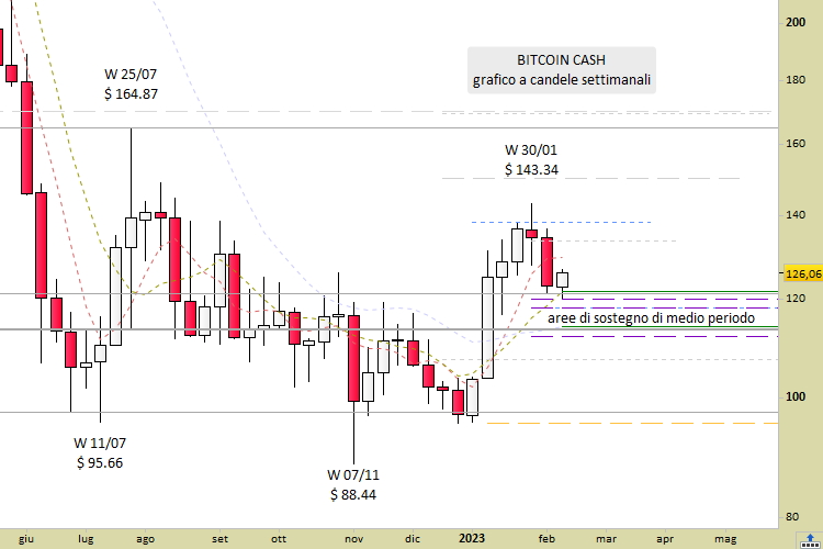 Dobbiamo sottolineare che, nonostante le debolezze delle ultime due settimane, Bitcoin Cash non aveva svolto finora un cattivo lavoro, in prospettiva di ampliamento del rialzo nel corso del 2023. Anzi, assecondando la ritrovata forza del mercato crypto in generale, anche BCH ha scavalcato durante le prime battute di gennaio le sue “vecchie” resistenze più òstiche, che nello specifico si trovavano a 113.00 e 122.00.