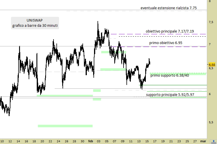 Le quotazioni di Uniswap (UNI) hanno ripreso coraggio a partire dai minimi di lunedì scorso a 6.09, e stanno anche oggi cercando di ampliare il rialzo nel cambio contro dollaro USA. I prezzi si sono spinti nel pomeriggio fino a 6.70, ma dobbiamo considerare che il quadro di fondo pare ancora dominato da una certa assenza di direzionalità. Nulla di strano, quindi, se nel corso delle prossime 5-10 giornate dovessimo assistere allo sviluppo di ripetuti cambi di tendenza, particolarmente in ambito intraday.