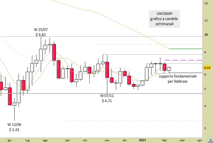 Grafico a candele settimanali. Prezzi fino al 15/02/23, ore 18.08, last 6.59