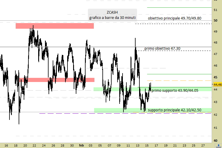 I supporti sono comunque confermati quasi sui medesimi livelli: il primo a 43.90/44.05 ed il principale a 42.10/42.50. Gli obiettivi vanno ridimensionati per il breve periodo (prossime 5-10 giornate); sono posti adesso a quota 47.30 e 49.70/49.80. Lo scenario tecnico verrebbe annullato dall’eventuale cedimento di quota 42.00, senza attendere altre conferme. Per eventuali modifiche al quadro operativo interverremo come sempre con segnali flash dal nostro canale Telegram. Ricordiamo che Zcash è quotato su tutti i migliori Exchange mondiali. Mentre scriviamo, viene passato di mano a 44.76 dollari, in aumento del +2.68% da ieri.