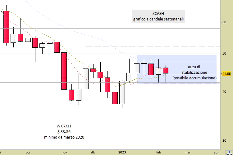 Il dato “pesante” che gioca, invece, contro ZCash, è lo scarso slancio rialzista cui si è assistito durante la prima metà di gennaio. La maggior parte delle crypto ha oltrepassato, in occasione di quel rally, le proprie resistenze di medio/lungo periodo. ZET invece si trova tuttora ancorato sotto alla linea dei 50.02, coincidente con i minimi di luglio 2022. Si tratta di un chiaro avviso ai naviganti: acque molto agitate sotto quota 42.00.