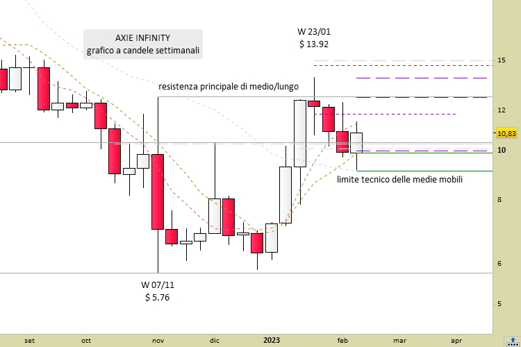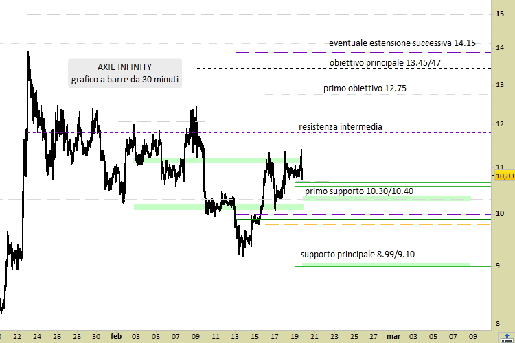 Nel contempo, è aumentata la probabilità che si possano sviluppare ultimi colpi di coda al ribasso in direzione dei 9 dollari, che tuttavia dovremmo considerare come occasioni di acquisto. I supporti si trovano adesso posizionati a 10.30/10.40 (il più vicino) ed a 8.99/9.10) il principale. Axie Infinity è scambiata su tutti i migliori Exchange mondiali, e viene passata di mano mentre scriviamo a 10.81 dollari, in calo del -1.01% da sabato.