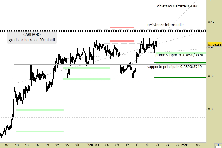 Le quotazioni di Cardano (ADA) attraversano da 5 sedute una fase di stabilizzazione contro dollaro USA. I prezzi hanno marcato il nuovo massimo di periodo a 0.4214 il 16 febbraio scorso, dopodiché si sono limitati ad effettuare ripetuti cambi di tendenza sopra quota 0.3858.